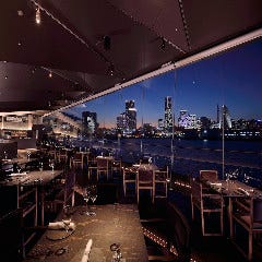 海の向こうに光り輝くみなとみらいの絶景を背景に